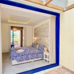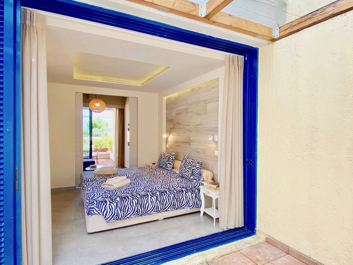 Inside, the house is set over 1 floor (split level) and has been carefully designed for summer living. The interiors, compact and functionals, are classy and modernly decorated. Huge windows provide plenty of natural light and an airy feeling. Entrance, via the private garden, is onto the spacious and air-conditioned lounge with adjoining kitchen / dining area. The lounge features a comfortable sofa, wi-fi internet connection, patio doors leading to the terrace at the front (equipped with table and chairs for al-fresco dining). The kitchen is well equipped and modern. The bedroom area (which can be separated from the lounge thanks to a set of sliding doors) has direct access to the rear terrace. There is a double bed that can be split into 2 twin beds according to the preferences of the guests. Fitted wardrobes are also available. There is a functional shower room, located next to the bedroom area.