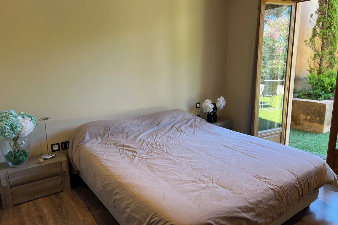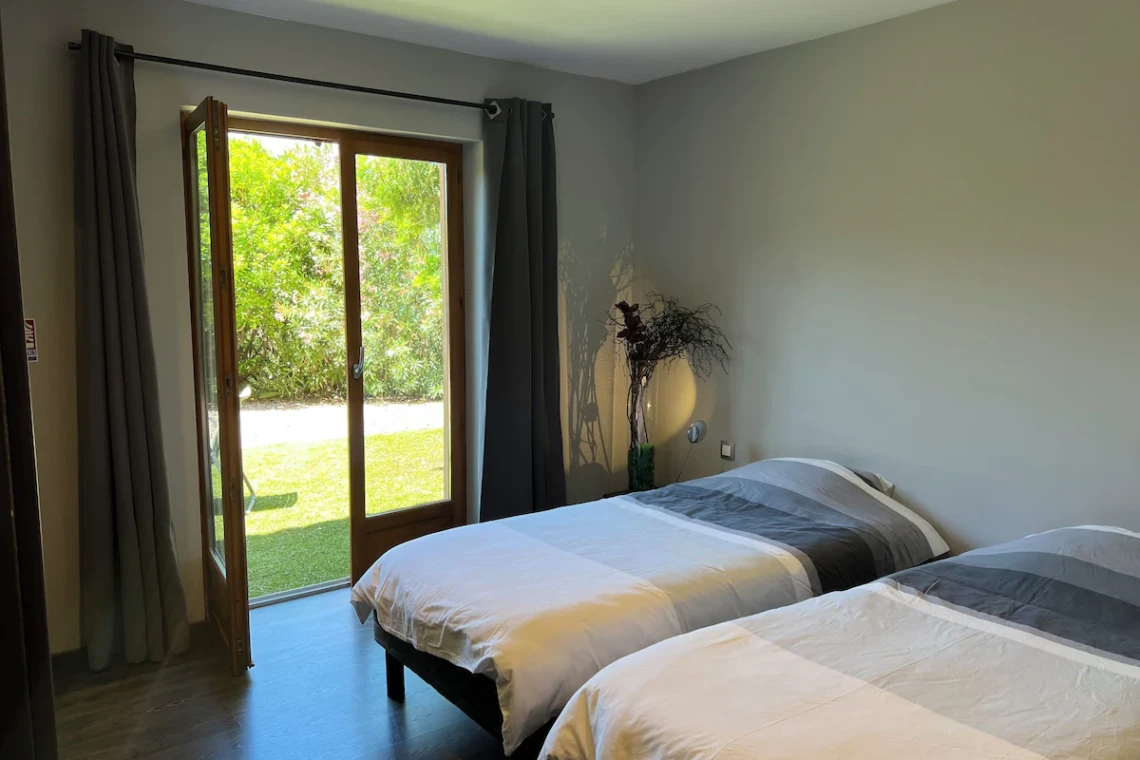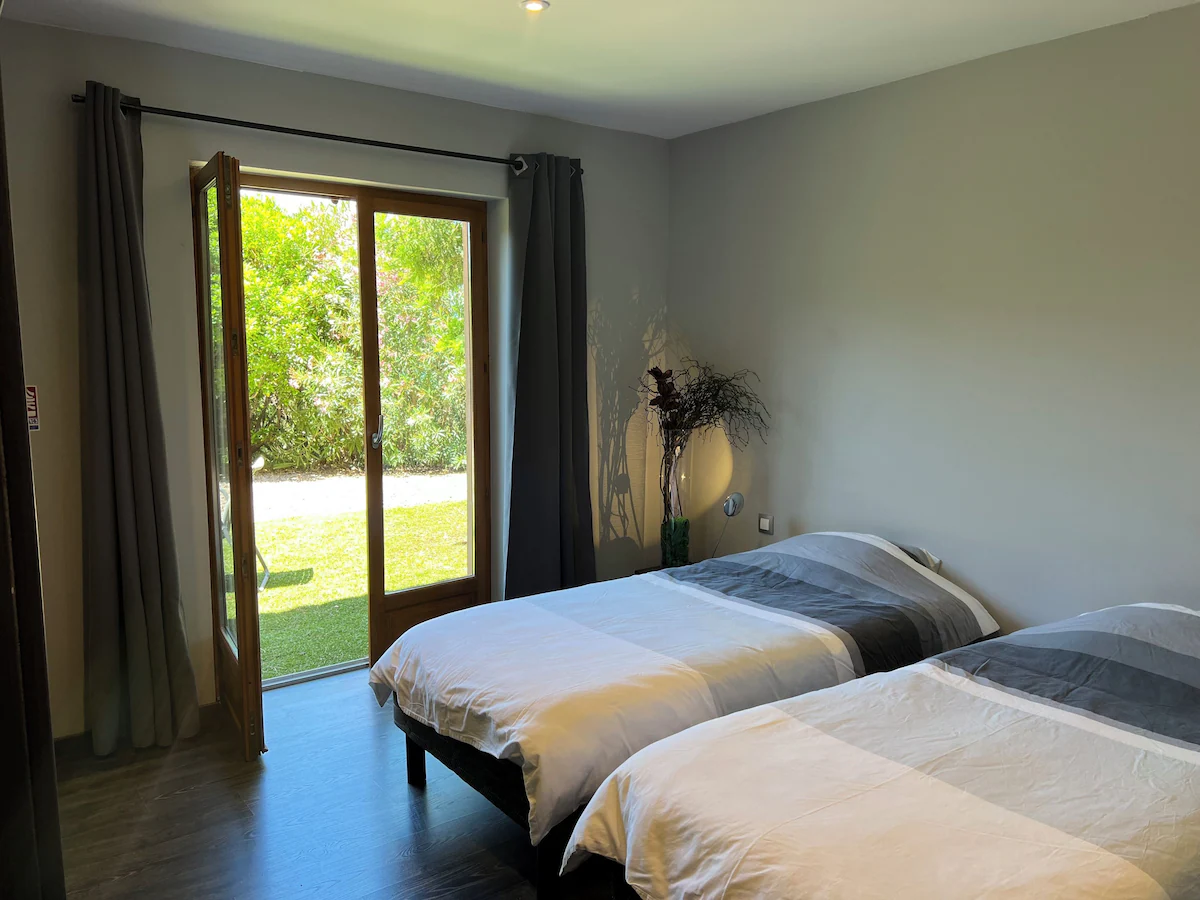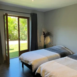 On the ground floor, 2 bedrooms, one with 2 single beds and a bathroom, the other with 1 double bed and a bathroom (walk-in shower and sink for 2).