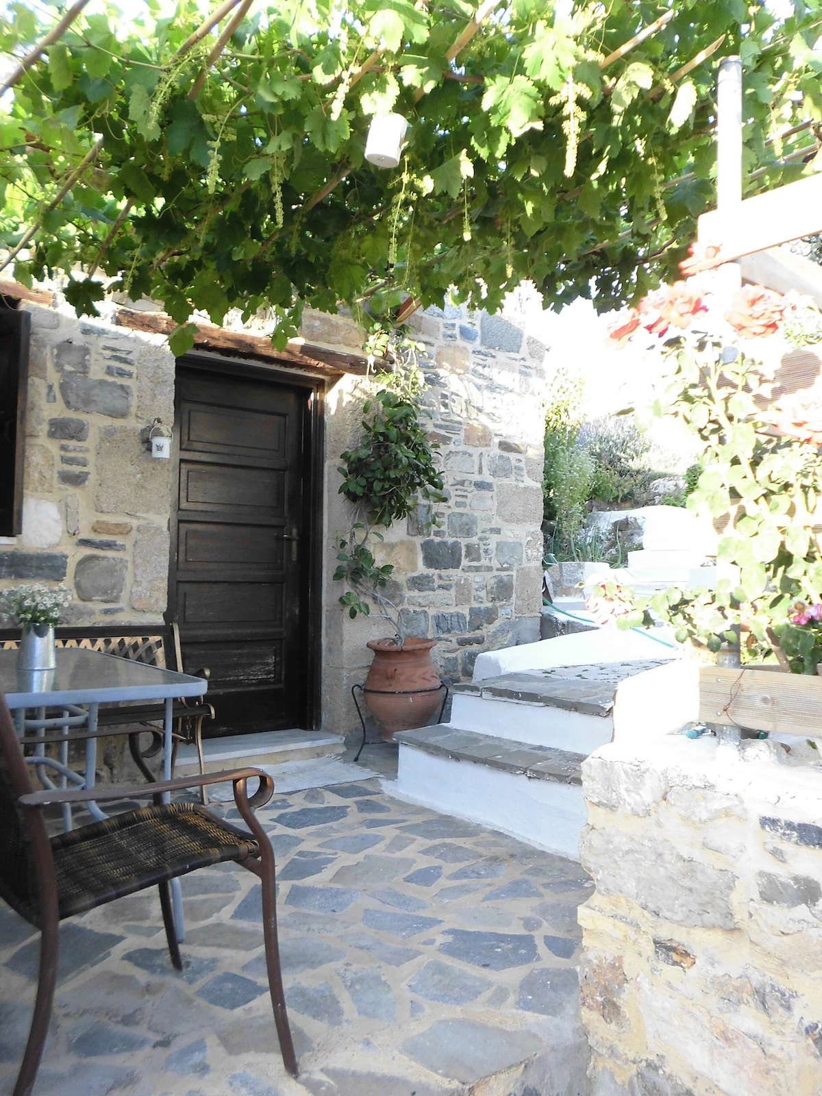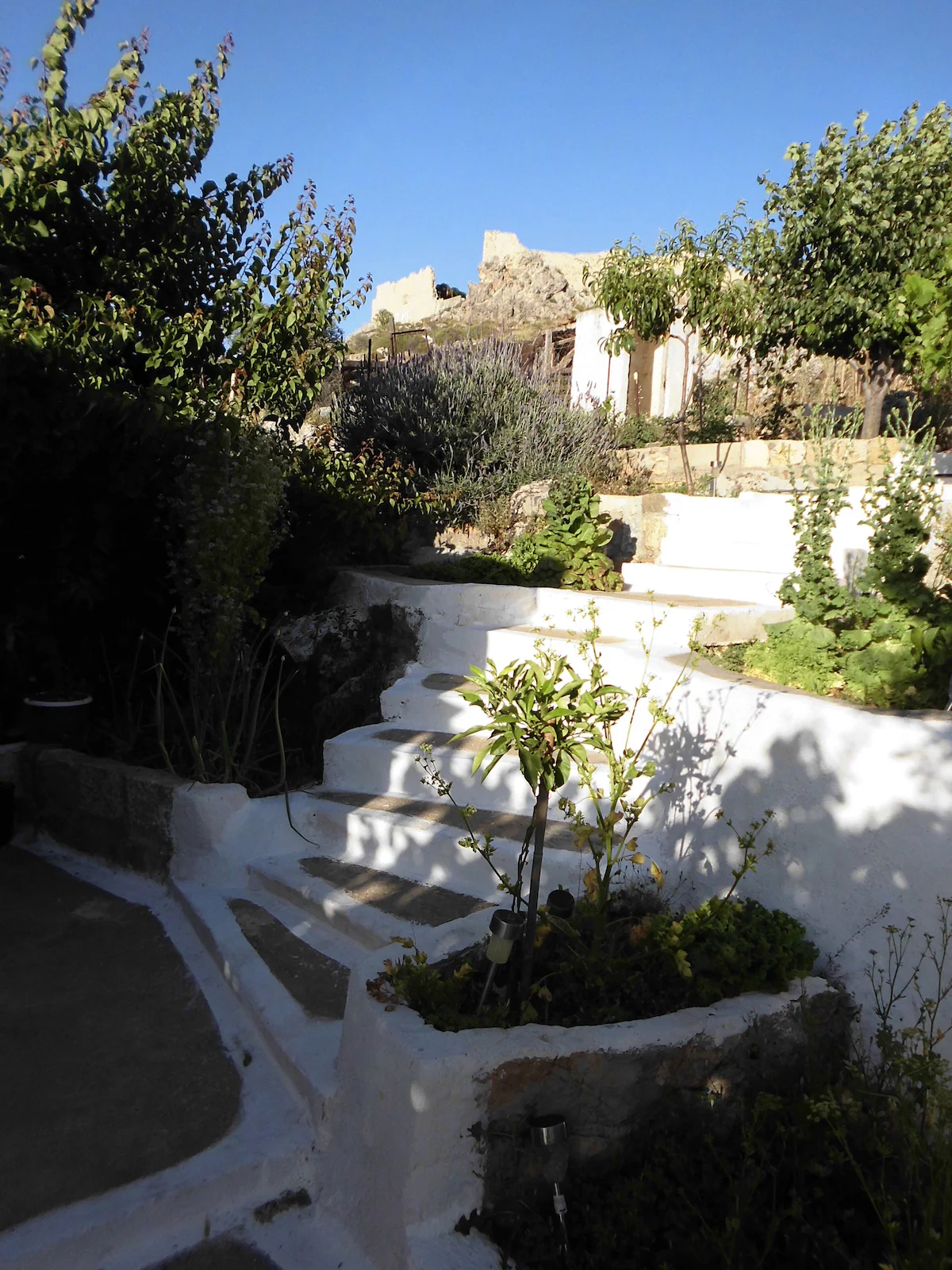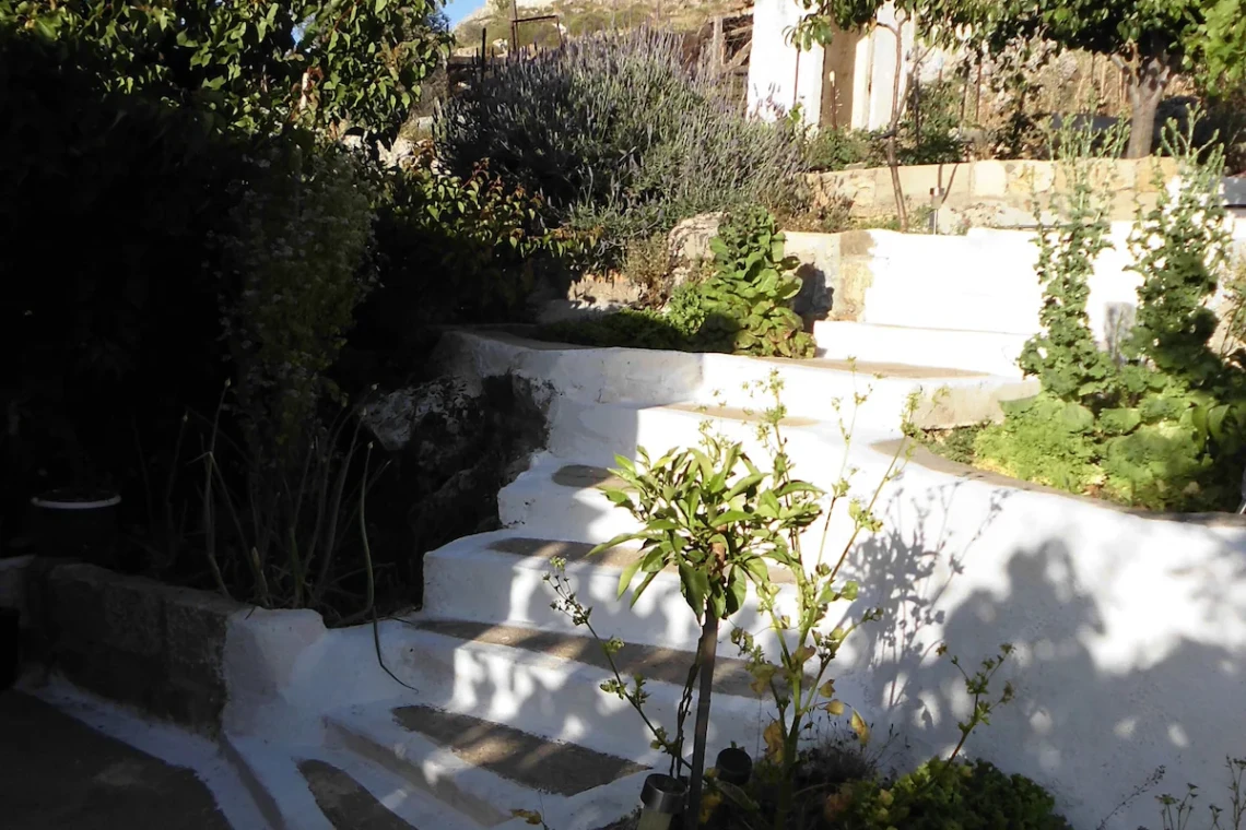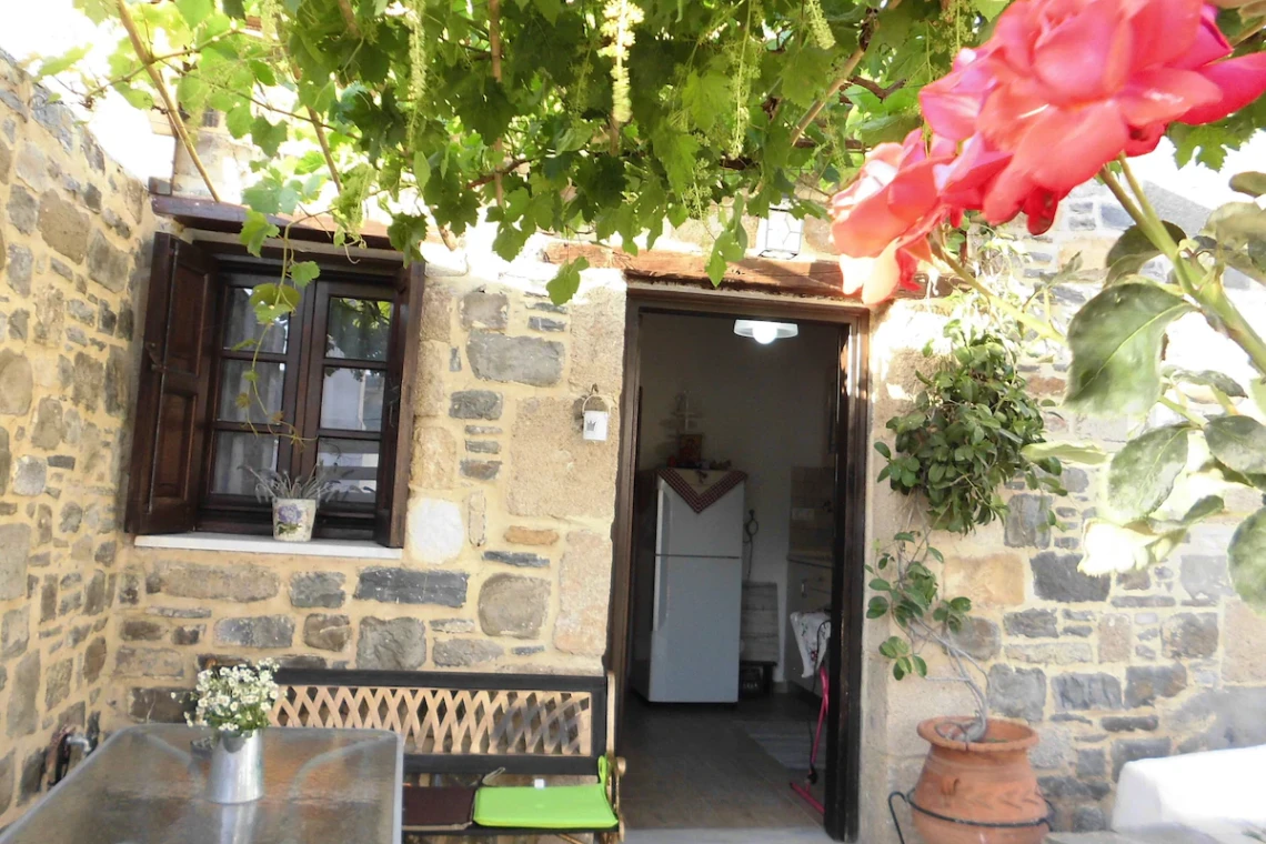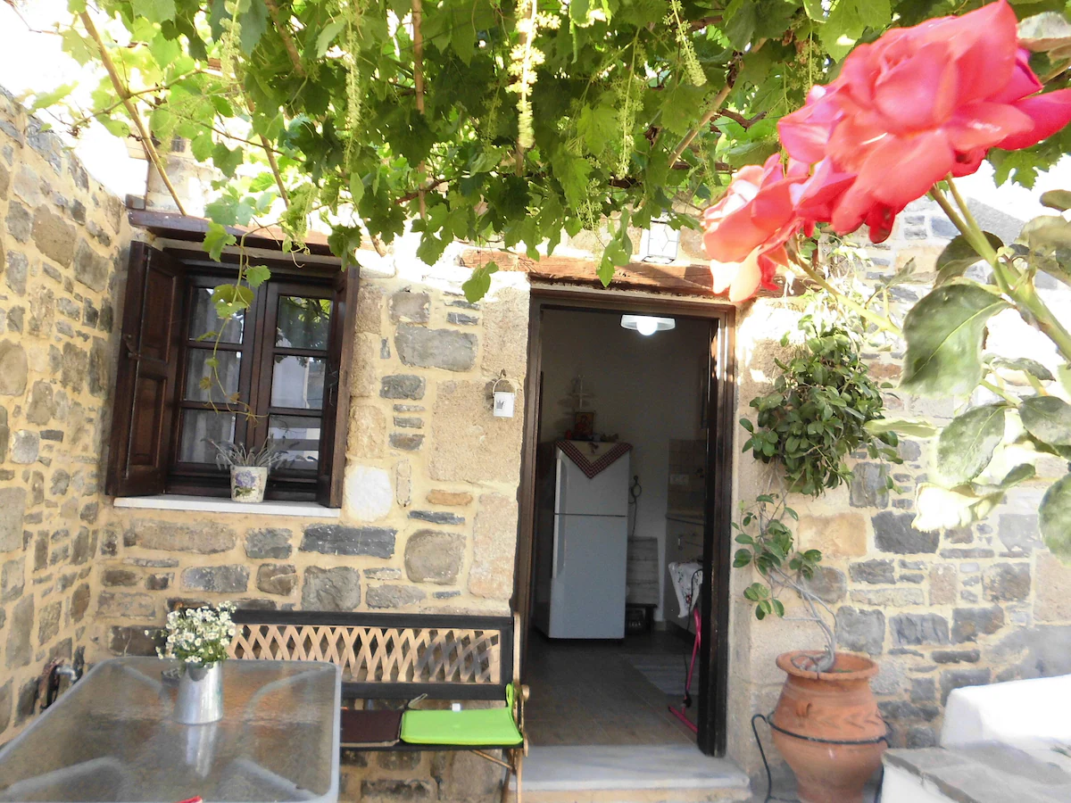 This little brown stone house, available year round, with reduced rate off-season, is perfect for a couple, or individual (see pictures, could accomodate small children too). If you want a real Greek town that is not a tourist town, but only a fifteen minute drive from popular Lindos, and only a five minute drive to both Stegna beach and Tsampika beach, this place is ideal. The town of Archangelos has well-stocked supermarkets and amazing fruit and vegetables stores, for food, and specialty stores for computers and phones, and other services, car rental and tour agency, and full medical services, pharmacies, and restaurants and gyro and souvlaki places, within a short walking distance of the house, which sits on the side of the hill next to the acropolis/castle, overlooking the town. The neighborhood is quiet and the house is tucked in a private corner under grapevines and nestled in a terraced garden. The castle ruins/acropolis is steps away, and contains the small church of Saint George and has a stunning view of sea, mountains and town, and is generally deserted, no tourists. (There are no gates or admissions fees, just walk right in any time of day or night and enjoy sunrise, sunset, moonrise, etc.) Also within a few steps are several lovely churches, some Byzantine, with lovely frescos, and the main parish church of Archangel Michael is also steps away. Monastery Tsampika is a five minute drive or just under half an hour walk. At Stegna beach are several topnotch tavernas with traditional seafood and other Greek fare.The location of the village on the East coast halfway down the island is convenient for sightseeing by car or bus all around our lovely island. The house has WIFI and AC, and for winter stays, heat and a beautiful stone fireplace.
