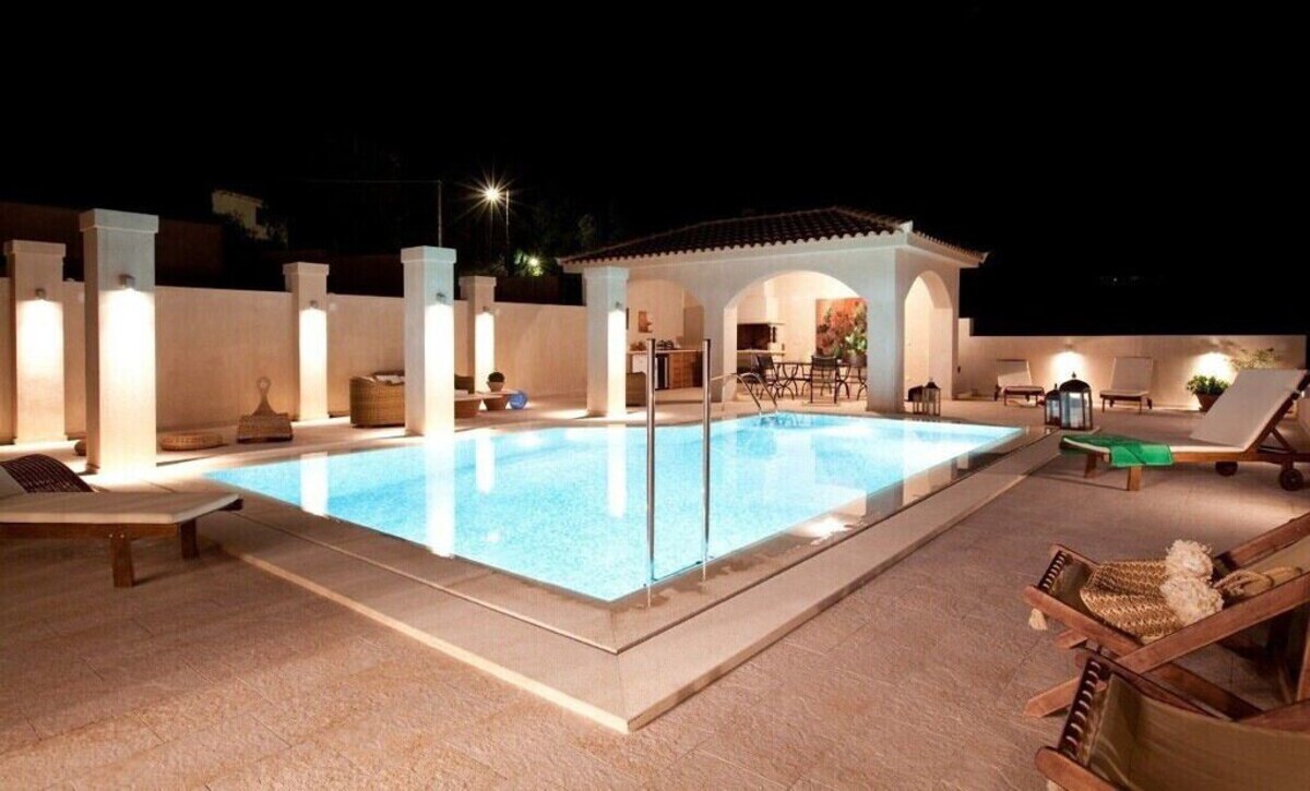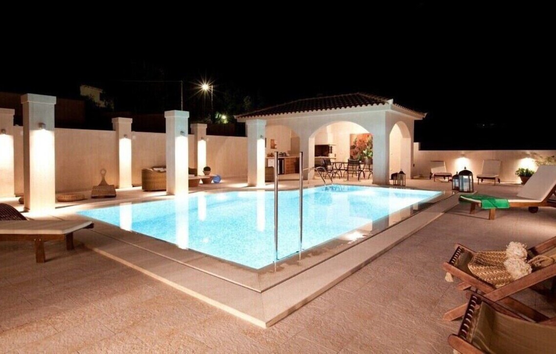 Skiathos Repos Villas consists of 2 very classy newly built luxury villas in Platanias. As soon as you approach the impressive entrance, you can sense it: The high standard design, the tastefully decorated spaces, the very elegant terrace and swimming pool area, everything breathes the lazy holiday feeling, everything is abundantly luxurious.