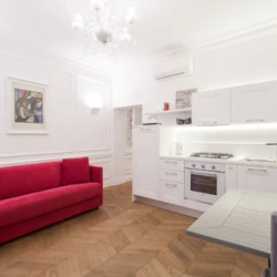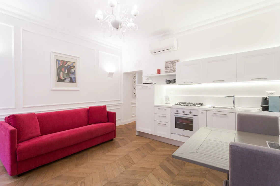 Refined in the furnishings and refined in details, versatile in the organization of spaces that are shaped to different needs, BeHomeRome gives the relaxing atmosphere of a private residence with the accuracy of personalized services, it is ideal for those traveling as a couple or family. The 40 sqm apartment has a living room with sofa bed, kitchenette (fully furnished kitchen), television and dining table. A small corridor separates the living area from the bedroom and the bathroom. The apartment is equipped to accommodate up to 4 people.