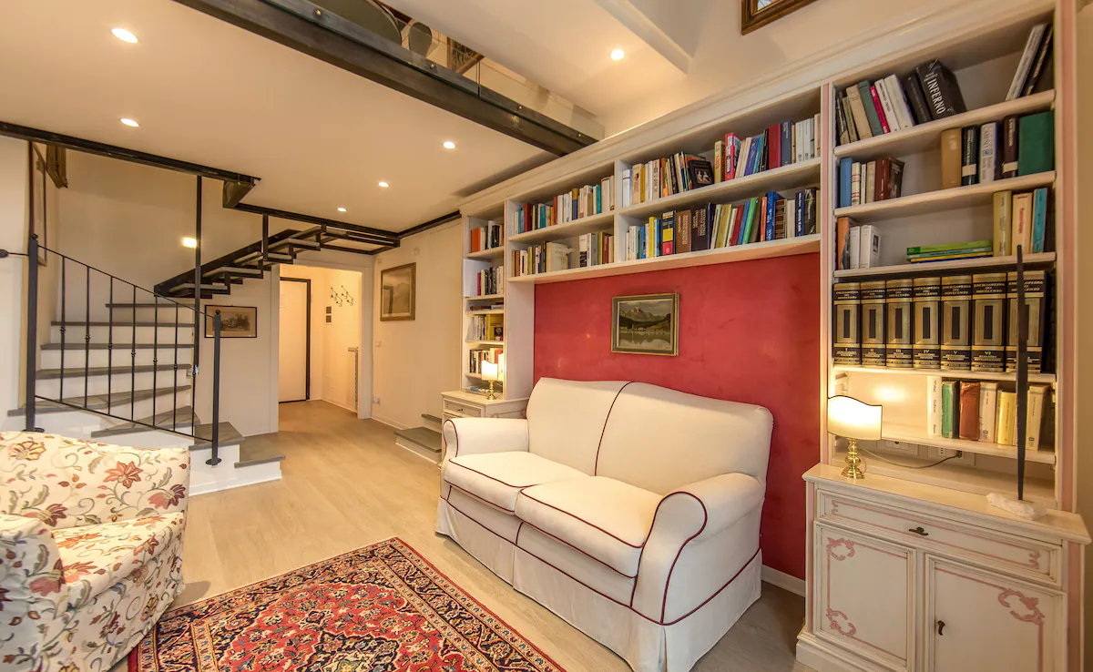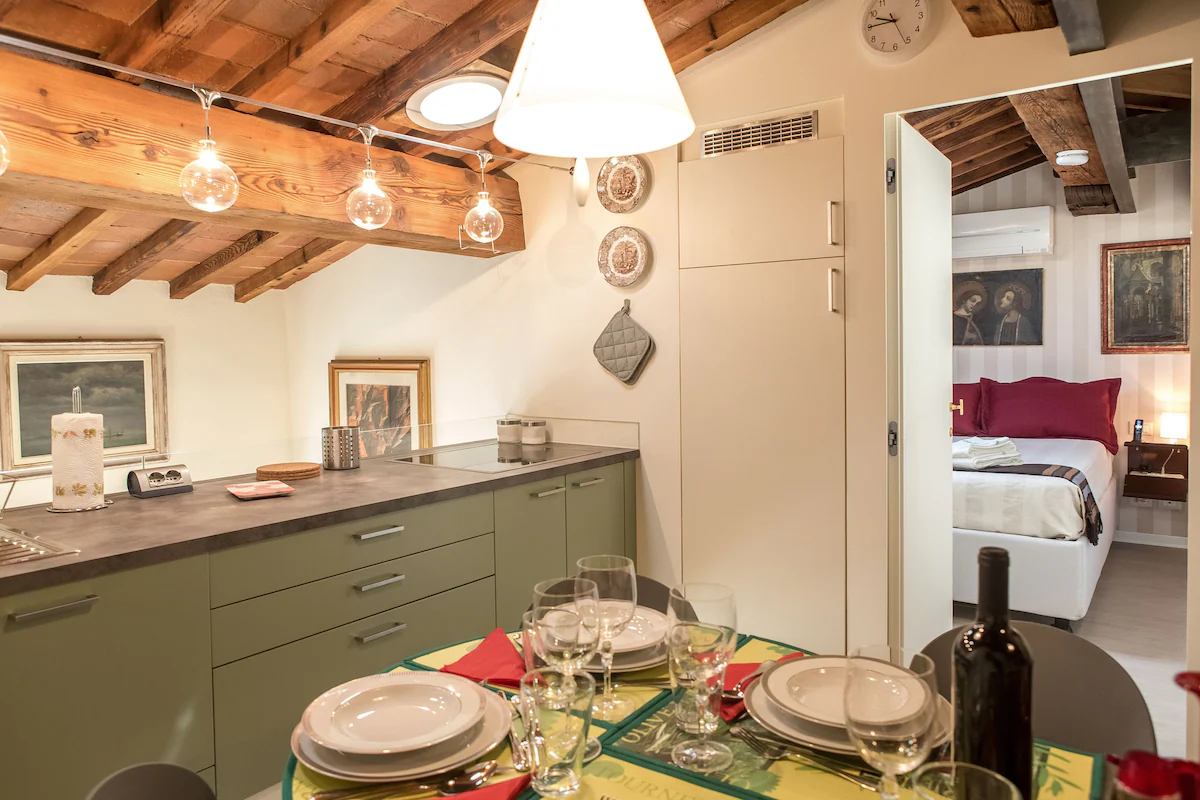 On the third floor of a tower-house in the Via Santa Elisabetta 2 (76 steps, no elevator) in the heart of the Roman and medieval Florence, this elegant apartment of 65 square meters it is on two levels. Downstairs we have the entrance, the living room, a bedroom, a bathroom with shower and terrace, overlooking the dome of the Duomo. Upstairs, the kitchen-dining room and a second bedroom.