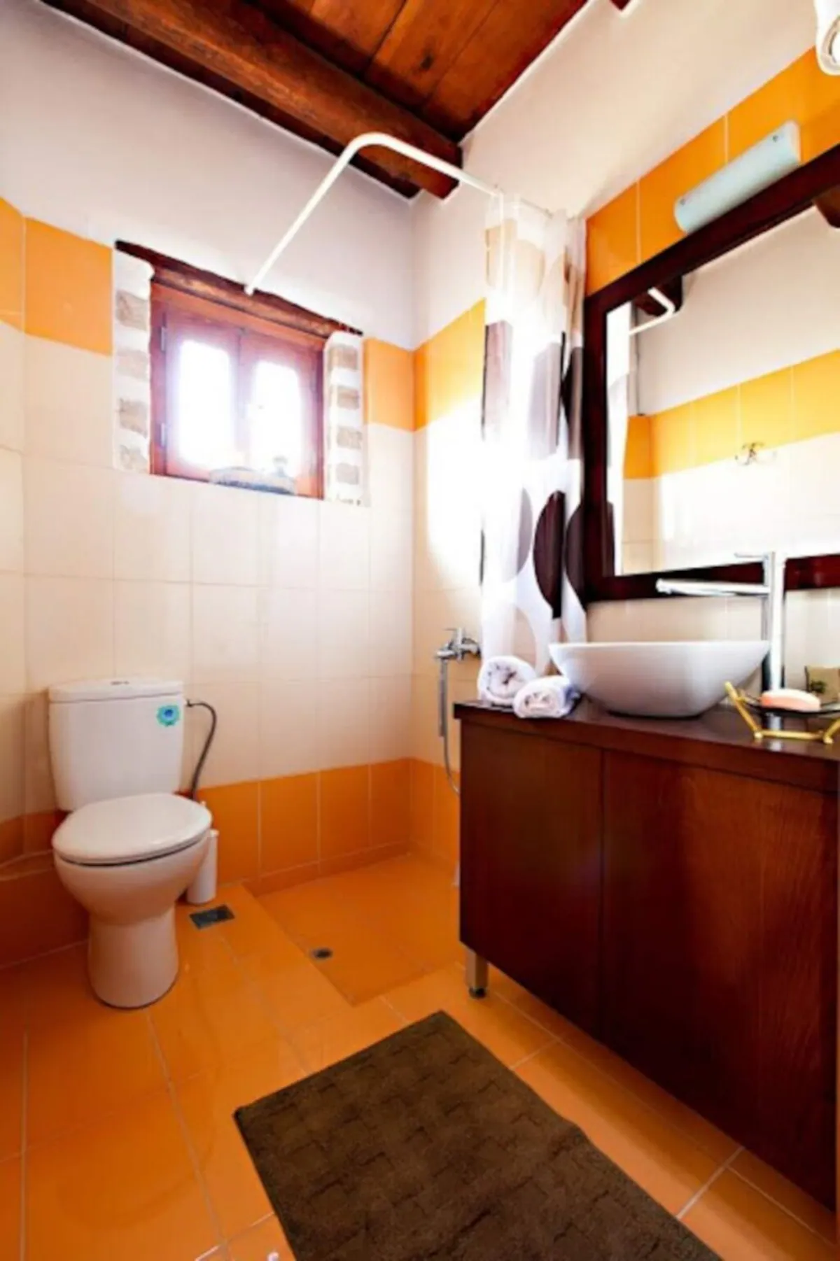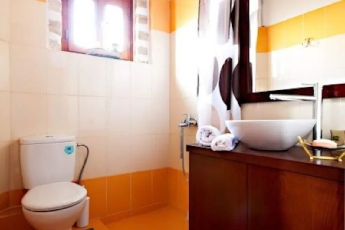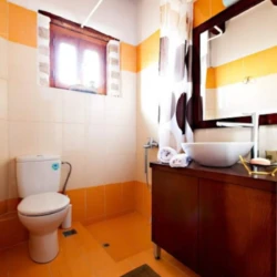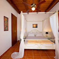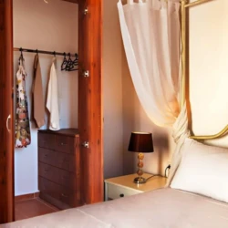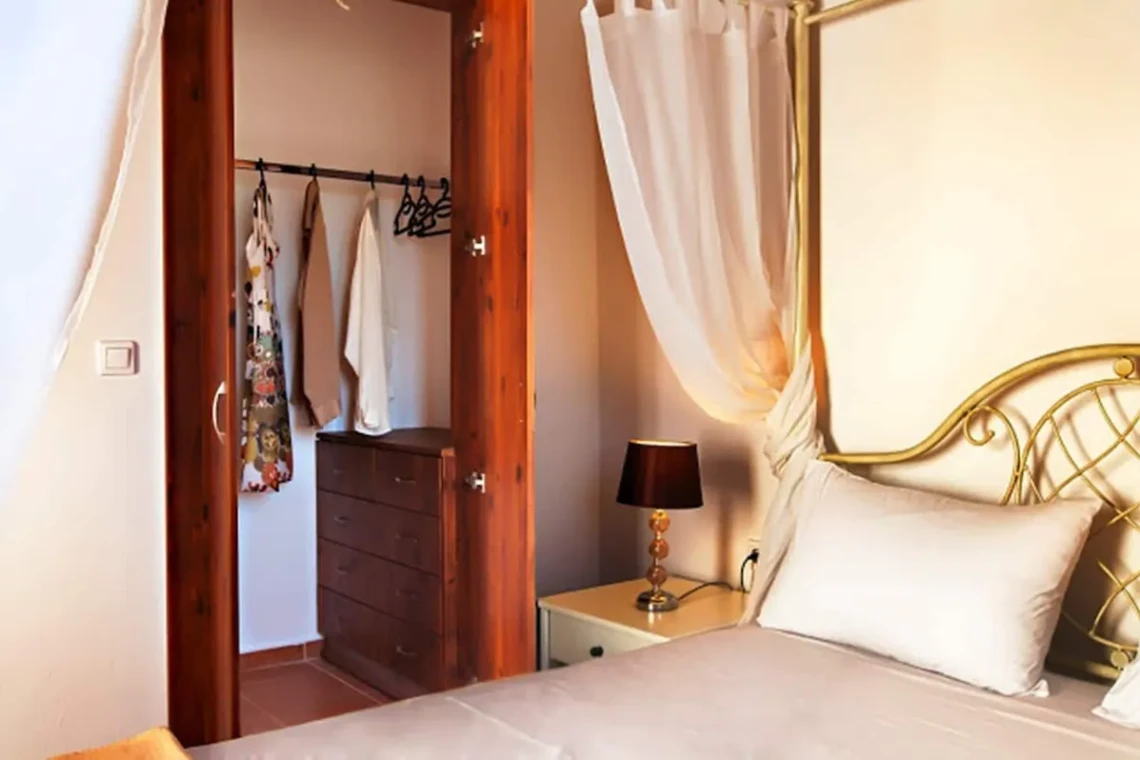 The interior of the house is very convenient and cosy. On the ground floor there is a kitchen, a living area, a twin bedroom , a bathroom and a small storage. In particular, the kitchen is fully equipped with a big fridge, cooker, built-in dishwasher, microwave oven, coffee maker, toaster and all the cooking utensils and cookware. In the living room there is an antique dining area, satellite TV and a fireplace which is operational during winter months. The bathroom downstairs has an enclosed shower and there is a washing machine in the wardrobe outside the bathroom. The bedroom on this floor has 2 standard sized single beds which can become a king sized bed upon request. A french door opens up to the pool area and allows tons of light to come in.