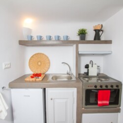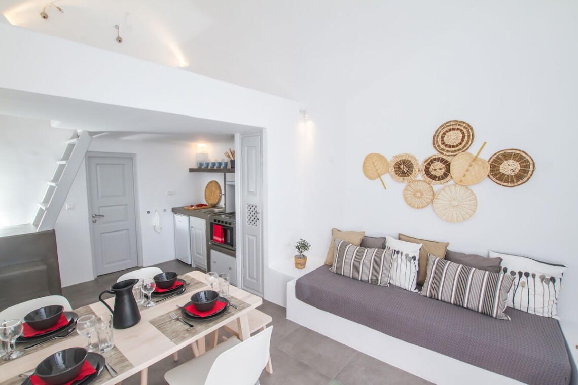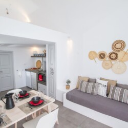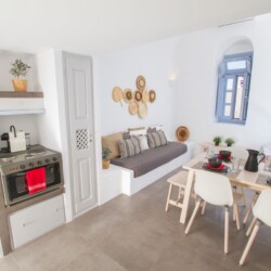 The cave house consists of two adjacent rooms, each one with its own entrance, but also with an interconnecting door. The first room features a double bed, a basic kitchenette and an en-suite bathroom. The second room is more spacious and offers a fully equipped kitchen, a dining/living area and an en-suite bathroom . The room also features an open loft with a double bed. Furthermore, the couch can be prepared as a single bed in order to sleep a fifth guest. Both rooms’ doors lead onto the house’s idyllic terrace that overlooks the endless blue of the dazzling caldera. Twin Cave House can comfortably host two couples, while offering them privacy, but is also ideal for families, or groups of friends.