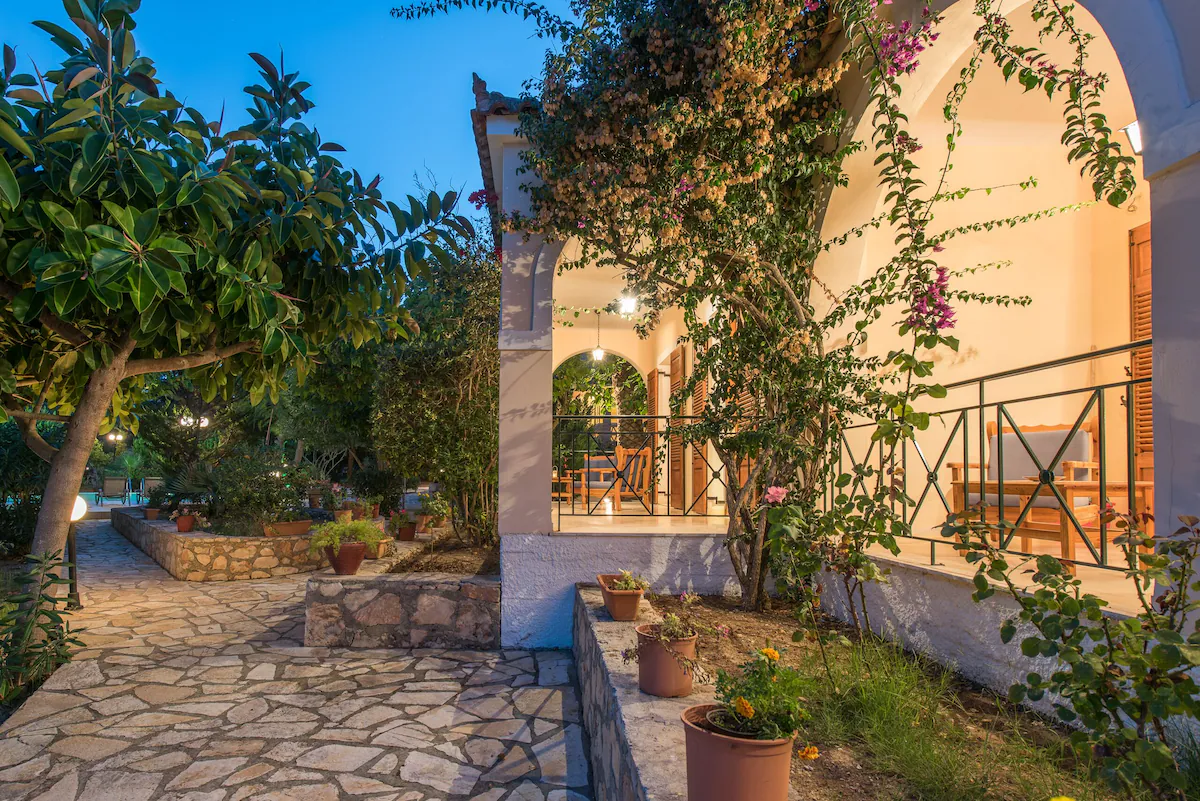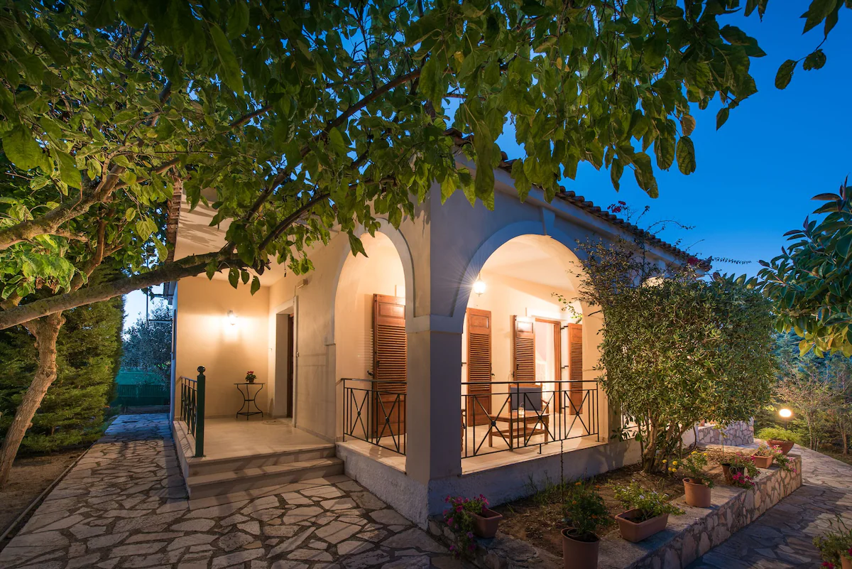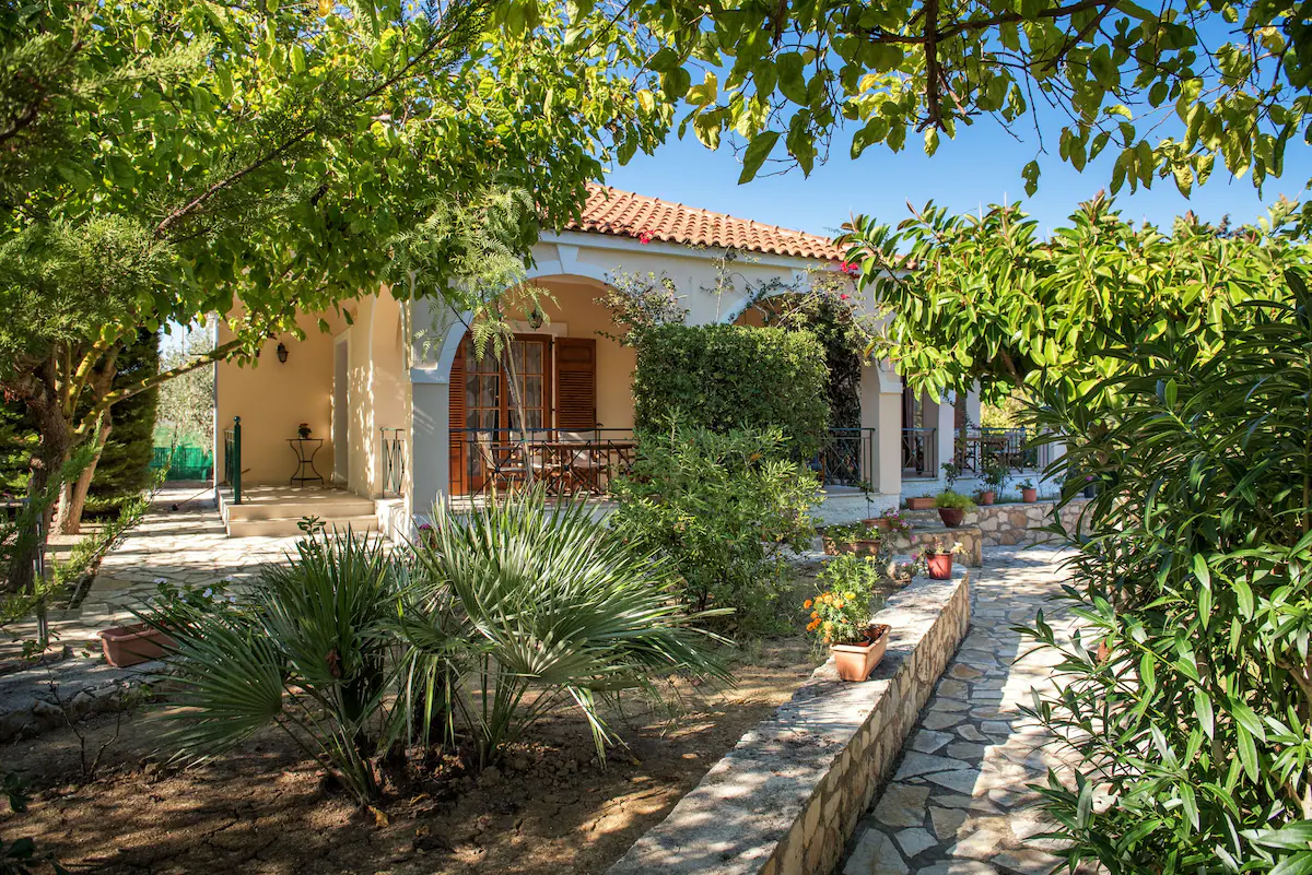 A VILLA with a sharing swimming pool among three villas, surrounded by a beautiful garden in Vasilikos area in Zakinthos island. The villa has 2 bedrooms , a fully equipped kitchen, a living room , a bathroom and a veranda . Free wi-fi provided. The villa has a/c and towels and sheet are changed twice a week. We also provide products for a gluten free diet after having contacted with us.